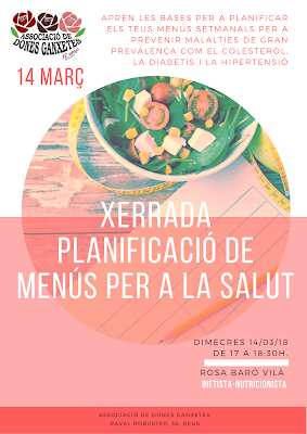 Dimecres 14 de Març seré a l’Associació de Dones Ganxetes de Reus on impartiré la xerrada: Planificació de Menús per